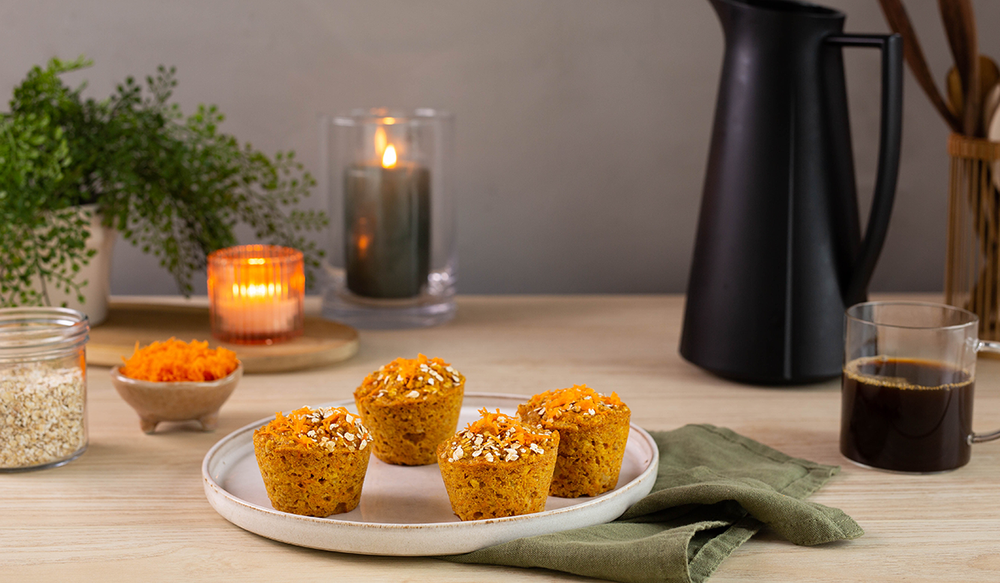 Disse saftige og litt sunnere muffinsene med havregryn har en herlig smak av gulrotkake. Spis dem nystekte eller ta dem med i matboksen til lunsj eller på tur. Oppskriften gir 8 til 10 muffins.