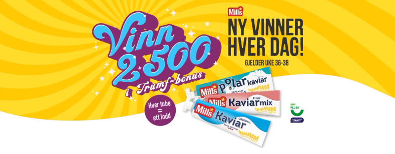 Er du KIWI PLUSS-kunde og kjøper en valgfri tube med Kaviar fra Mills, kan du vinne Trumf-bonus til en verdi av 2 500 kroner – hver dag! Konkurransen varer fra uke 36-38 (2. september – 22. september).