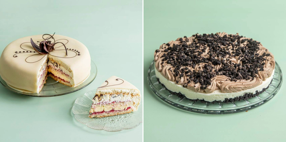 Blant kakene du kan velge mellom er favorittene våre konditorens anbefaling: Marsipankake og Oreokake.