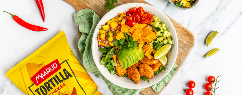 - Topp med skivet kylling, mangosalsa og knust Maarud Tortilla Cheese og nyt!