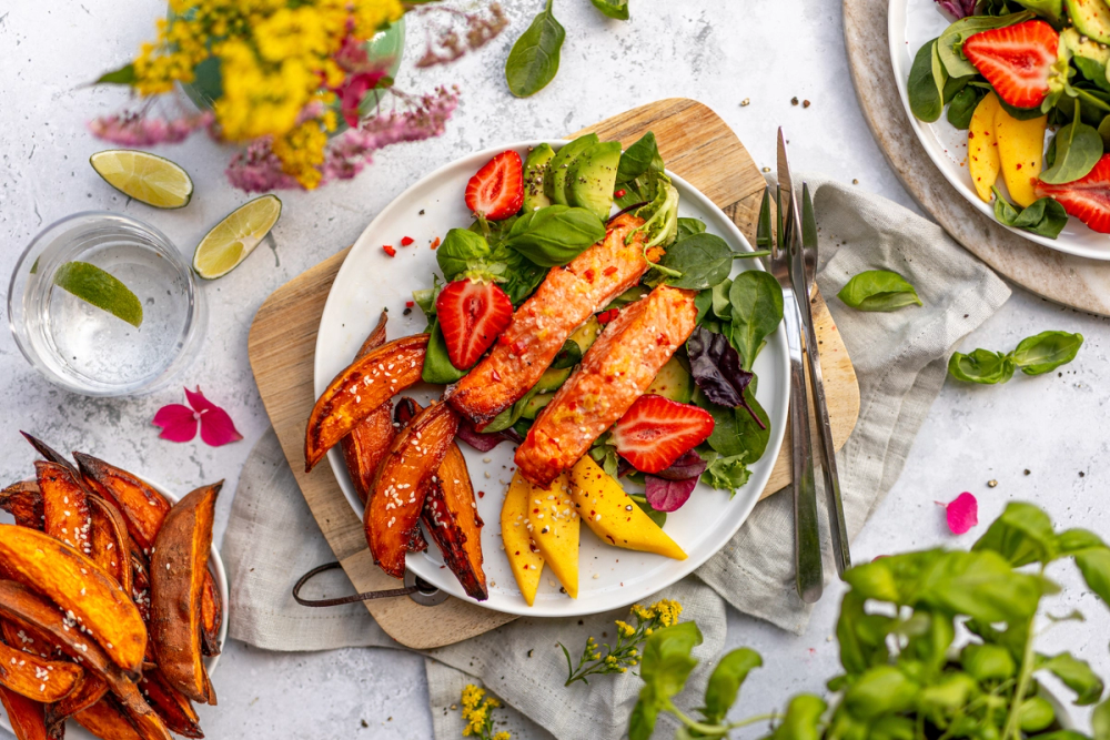 Grillet laks med frisk sommersalat og søtpotetbåter