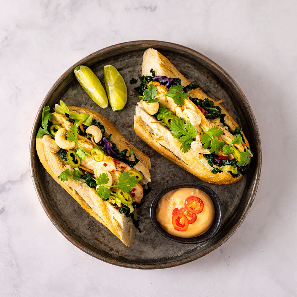 - Fyll bagettene med kålmiks, kylling og noen stilker koriander. Dryss på med cashewnøtter og litt ekstra grønn chili.