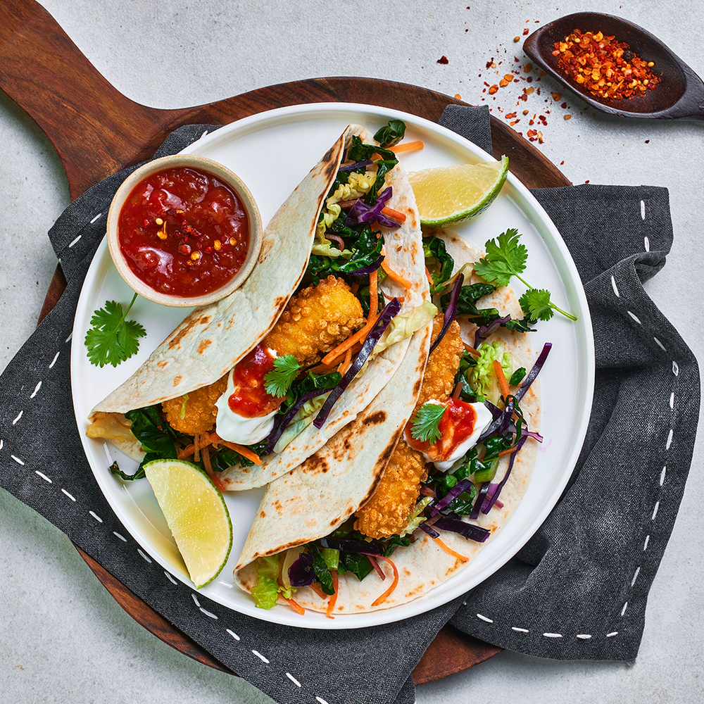 - Server tortillalefser med stekt kål, fiskepinner, rømme og tacosaus. Topp med koriander og en skvis lime.