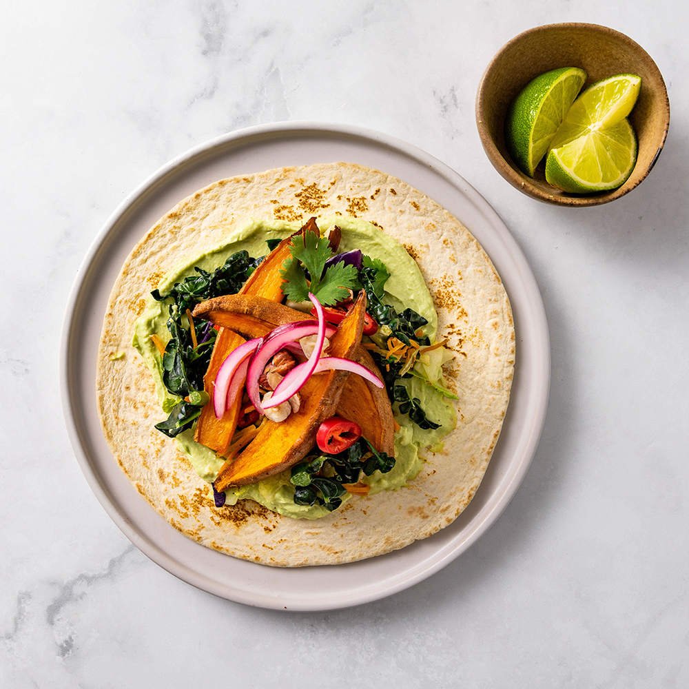 - Anrett tacoene. Start med tacolefse i bunn og smør ut avokadokremen. Ha over kålmiksen, bakt søtpotet, syltet rødløk og noen stilker koriander.