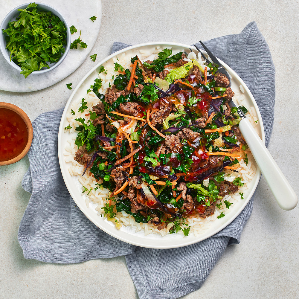 - Anrett i en stor bolle eller i fire porsjonsskåler. Legg risen nederst, deretter stekt karbonadedeig og kålmiks. Topp med sweet chilisaus og grovhakket kruspersille.