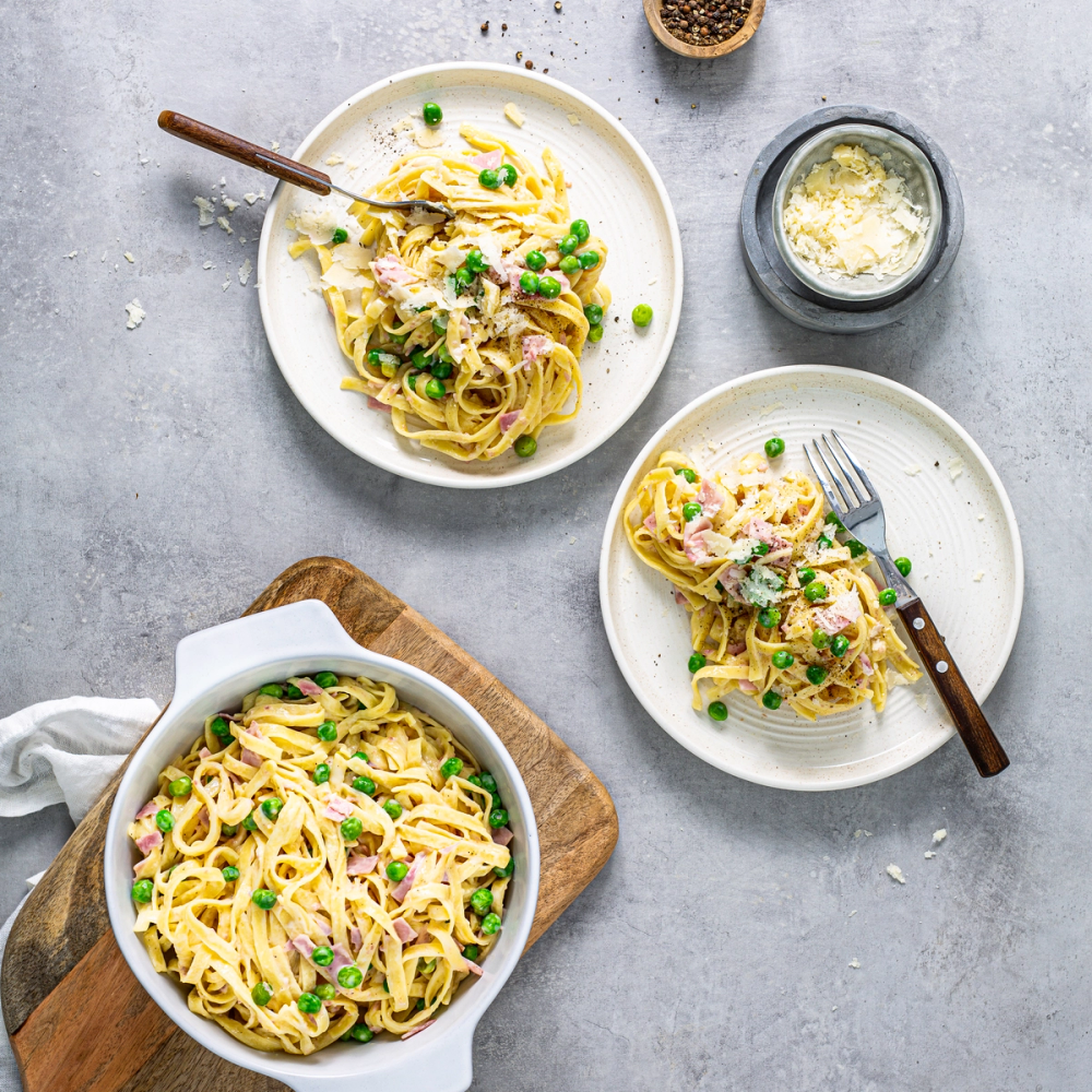 Kremet pasta er kjapp, enkel og smakfull middag, som både store og små liker. Denne varianten med skinkeost, skinke og erter kan raskt bli en hverdagsfavoritt. Oppskriften gir 4 porsjoner.