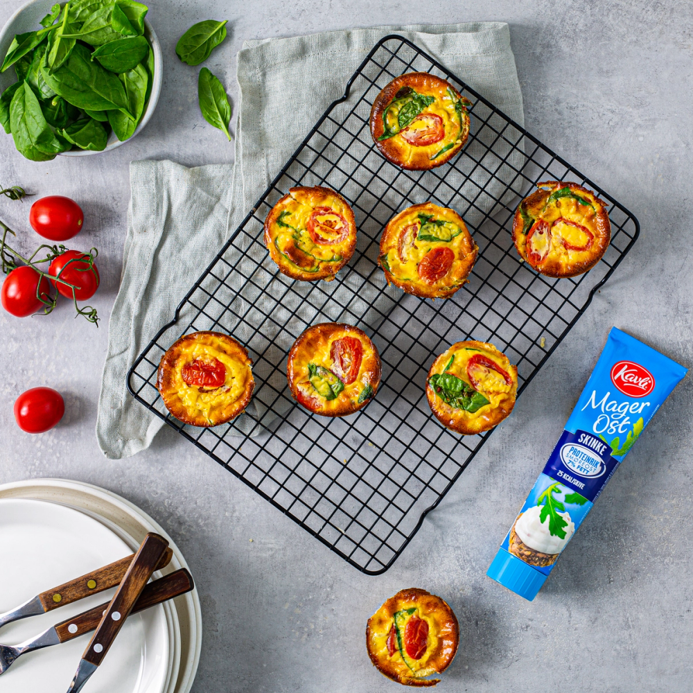 - Legg cherrytomater delt i biter og litt spinat sammen i hver paibunn og hell røren over.