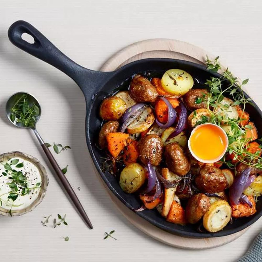 Pytt i panne er den perfekte resteretten. Følg oppskriften som du finner den her, eller bruk rester av grønnsaker og potet etter gårsdagens middag. Alt fra potet, squash, løk og paprika passer godt sammen med kjøttbollene.