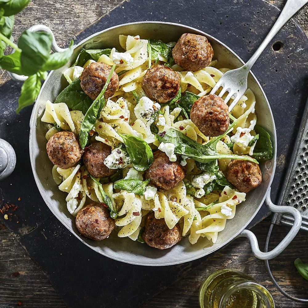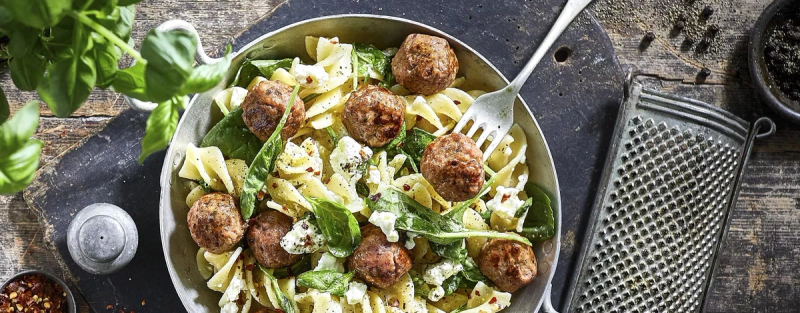 Kjøttboller med pasta er en klassiker. Tilsett salatost og spinat, eller det du ønsker av grønnsaker, så har du en smakfull familiefavoritt på bordet i en fei. Hele oppskriften kan du se her.
