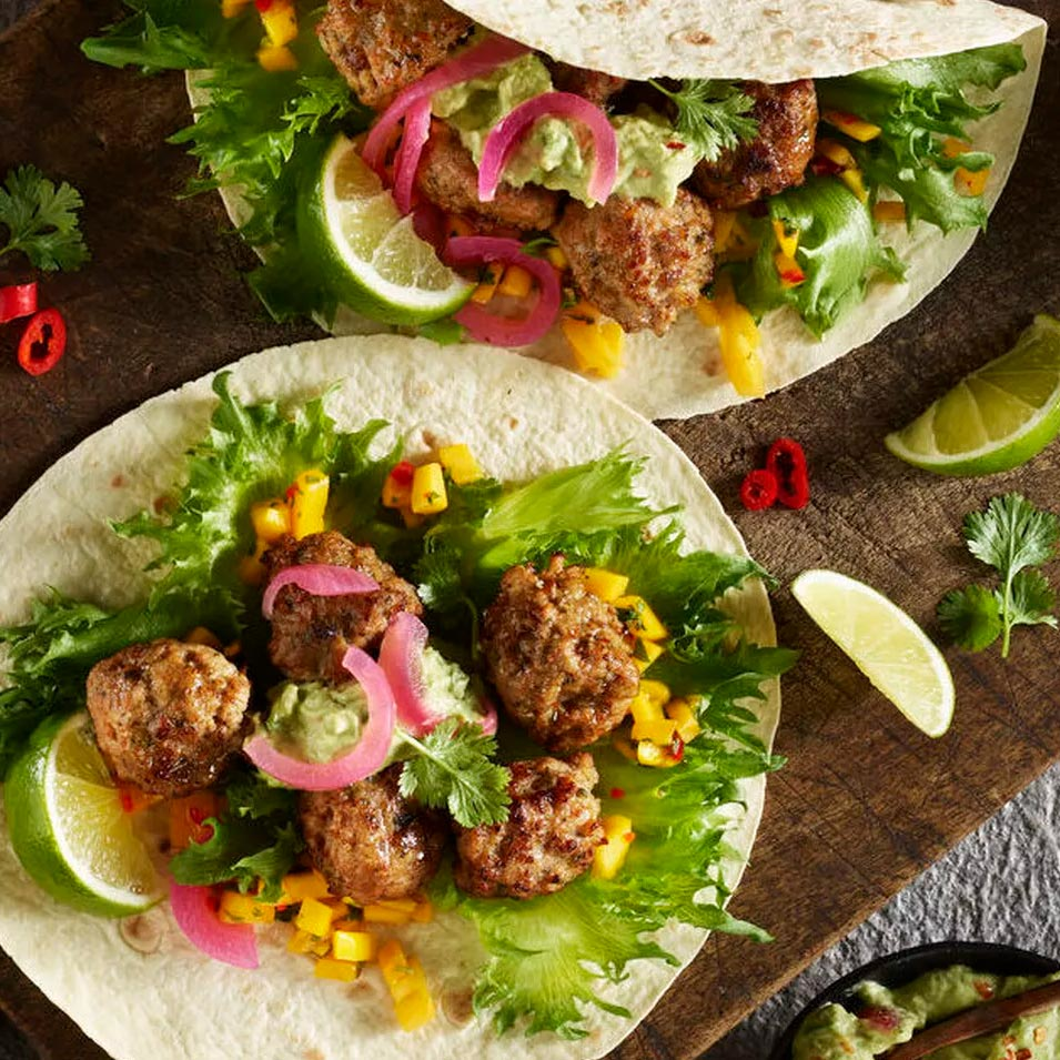 Slik har du kanskje aldri servert kjøttboller før? Kjøttbolletaco er en herlig vri på den tradisjonelle tacoen. Med syltet rødløk, mangosalsa og guacamole får du en frisk og digg middaggsrett som kan spises til hverdags. Oppskriften finner du her.