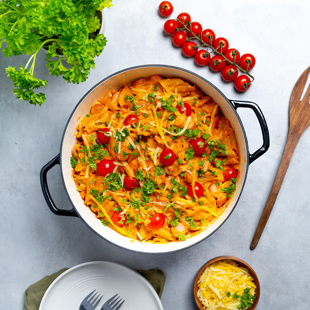- Tilsett pølsebitene, cherrytomatene, grønnsaksbuljong, pastasaus og pasta i kjelen, kok opp og la det småkoke under lokk i cirka 15 minutter. Rør fra tid til annen, slik at det ikke setter seg fast.