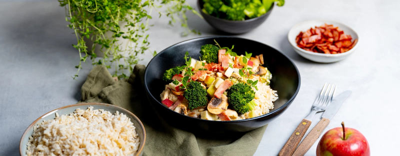 - Rør inn eplebitene rett før servering, og server med fullkornsrisen.