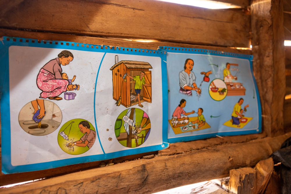 Rundt hundre meter fra grønnsakshagen og skolen finner vi Fenshasys hus. Fem kvadratmeter bygget av leire, tynne trestokker og slitt tau. Hun legger et fargerikt gulvteppe av plast på bakken og inviterer smilende inn. Hun har en seng og litt gulvplass, og på veggen henger en plakat med informasjon om god håndhygiene.