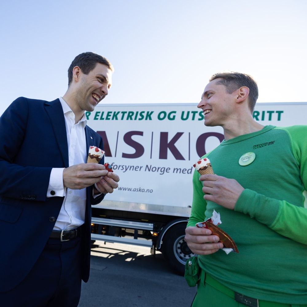 Klima- og miljøminister Andreas Bjelland Eriksen (Ap) og Erlend Mo Danielsen, butikksjef ved KIWI Bogstad, feirer med is.Norges første el-lastebilsjåfør, Samir Lachheb, konsernsjef i NorgesGruppen, Runar Hollevik og butikksjef ved KIWI Bogstad, Erlend Mo Danielsen.