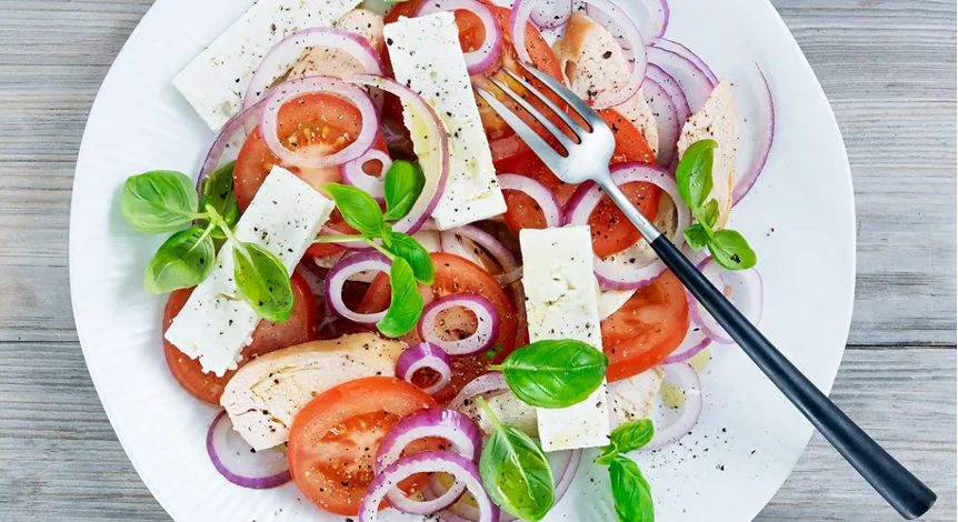 - Kutt tomater i skiver og løken i ringer. Bryt fetaosten i grove biter. Legg tomat og løk lagvis på et fat, dryss over osten. Server med varm kylling, hvor du avslutter toppingen med grovhakket basilikum, samt et dryss med olivenolje, salt og pepper.