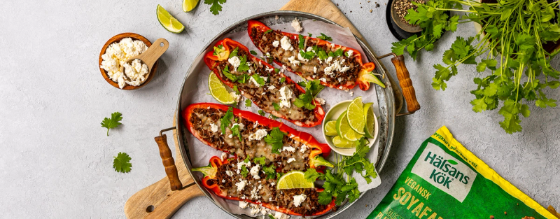 - Stek løk og hvitløk med cumin, paprikapulver, timian og chili. La det surre et par minutter og tilsett deretter Hälsans Kök soyafärs. Brun soyafärsen til den er gjennomstekt og gyllen. Tilsett hakkede tomater, og la det småkoke i 10 minutter. Stek paprikaene i ovnen i ca 10 minutter.